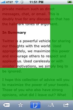 On the iPad, the usage is very different: it’s usually held two-handed by its sides, and the margins are so thick that there’s no need to avoid hitting linked elements (because there aren’t any in the margins).
