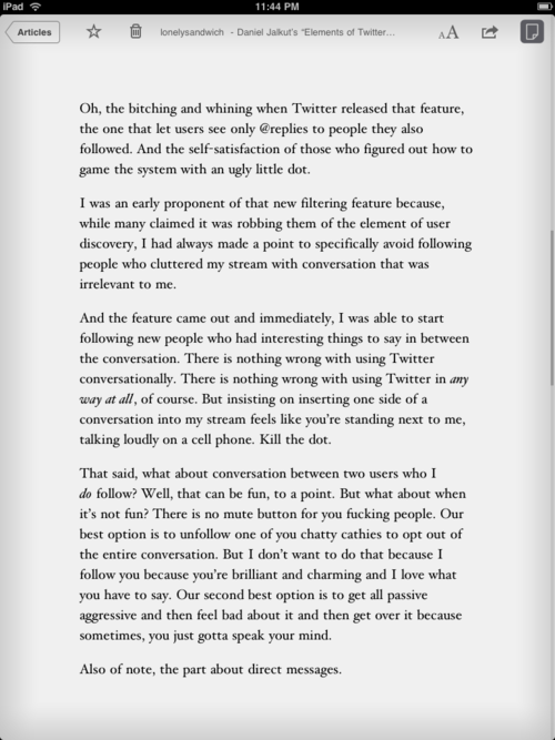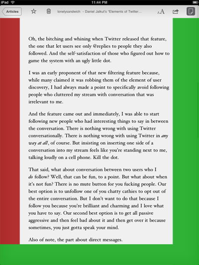 The iPad screen is actually too large for comfortable text reading spanning the entire width unless you move to multiple columns, which is a technical challenge that I’m not ready to tackle yet (especially since I don’t particularly like multi-column reading).