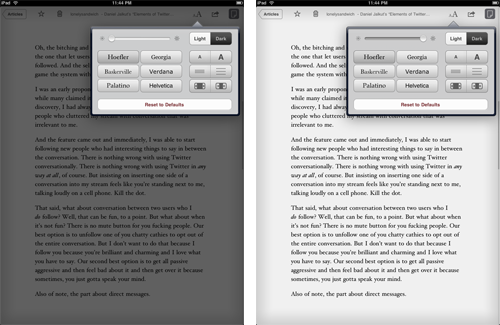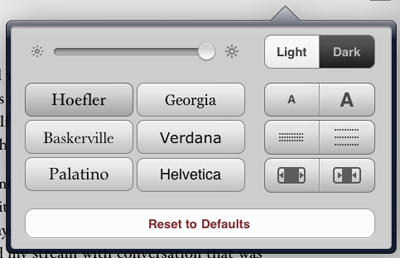 In addition to the aforementioned brightness control, there are now three new fonts (Hoefler Text, Baskerville, and Palatino), and you can now toggle Light/Dark mode without leaving the article or opening the Settings panel. In a future version, I’ll probably remove the Dark-mode toggle from the Settings panel, as it’s now redundant.