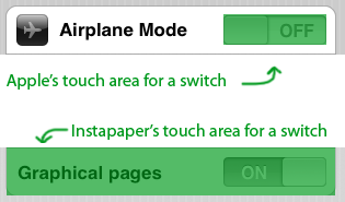 The next version’s settings switches also have a useful little interface tweak: the touch-target area to toggle the switch is the entire table row, not just the switch widget.
