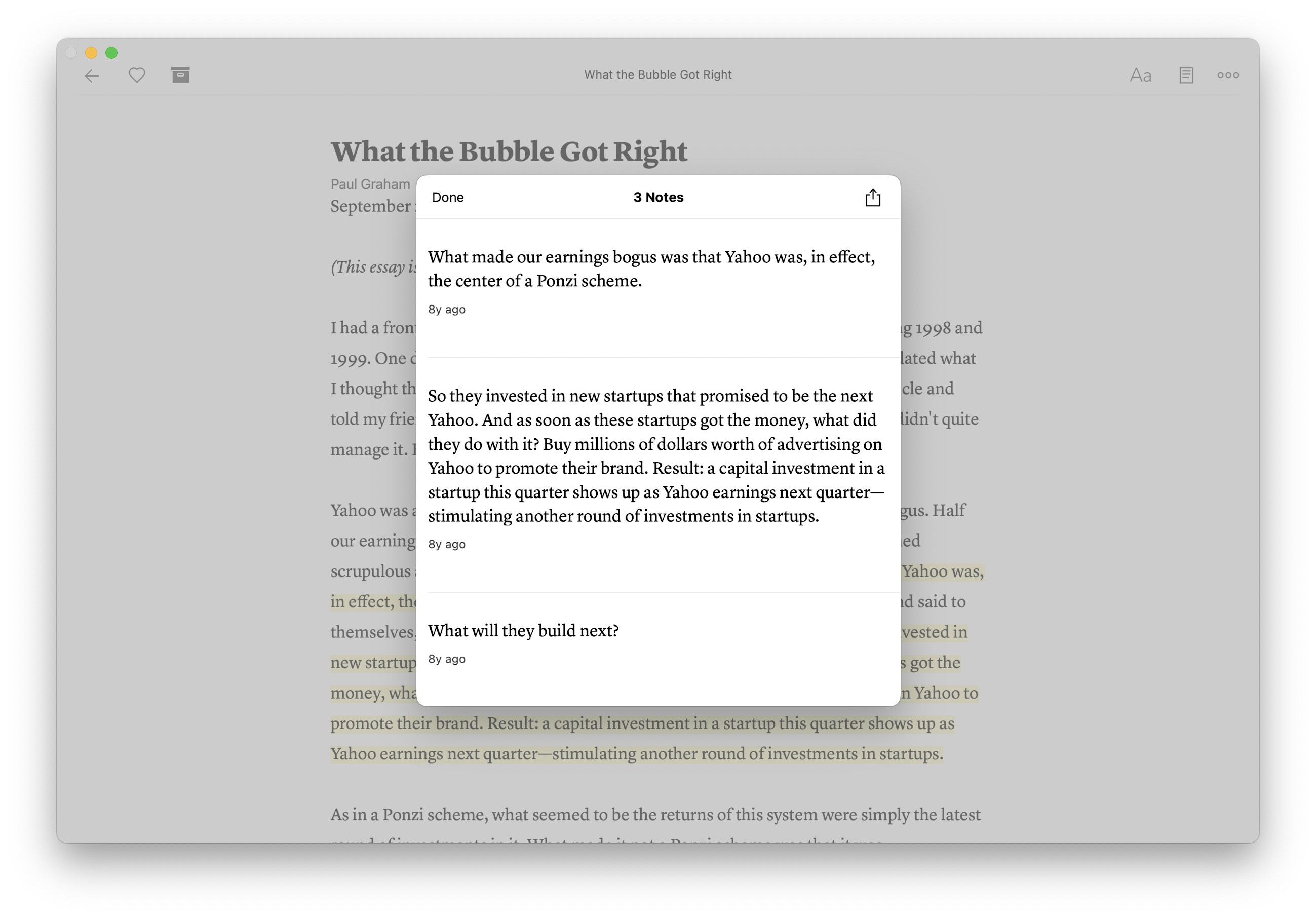 This has been a long-time feature request, and we’re glad to finally launch grouped notes by article. By default, we will now show your notes organized by article on iOS and macOS. If you prefer the most recent notes first, you can tap the menu on the top right “…” and select “Sort by Recent”.