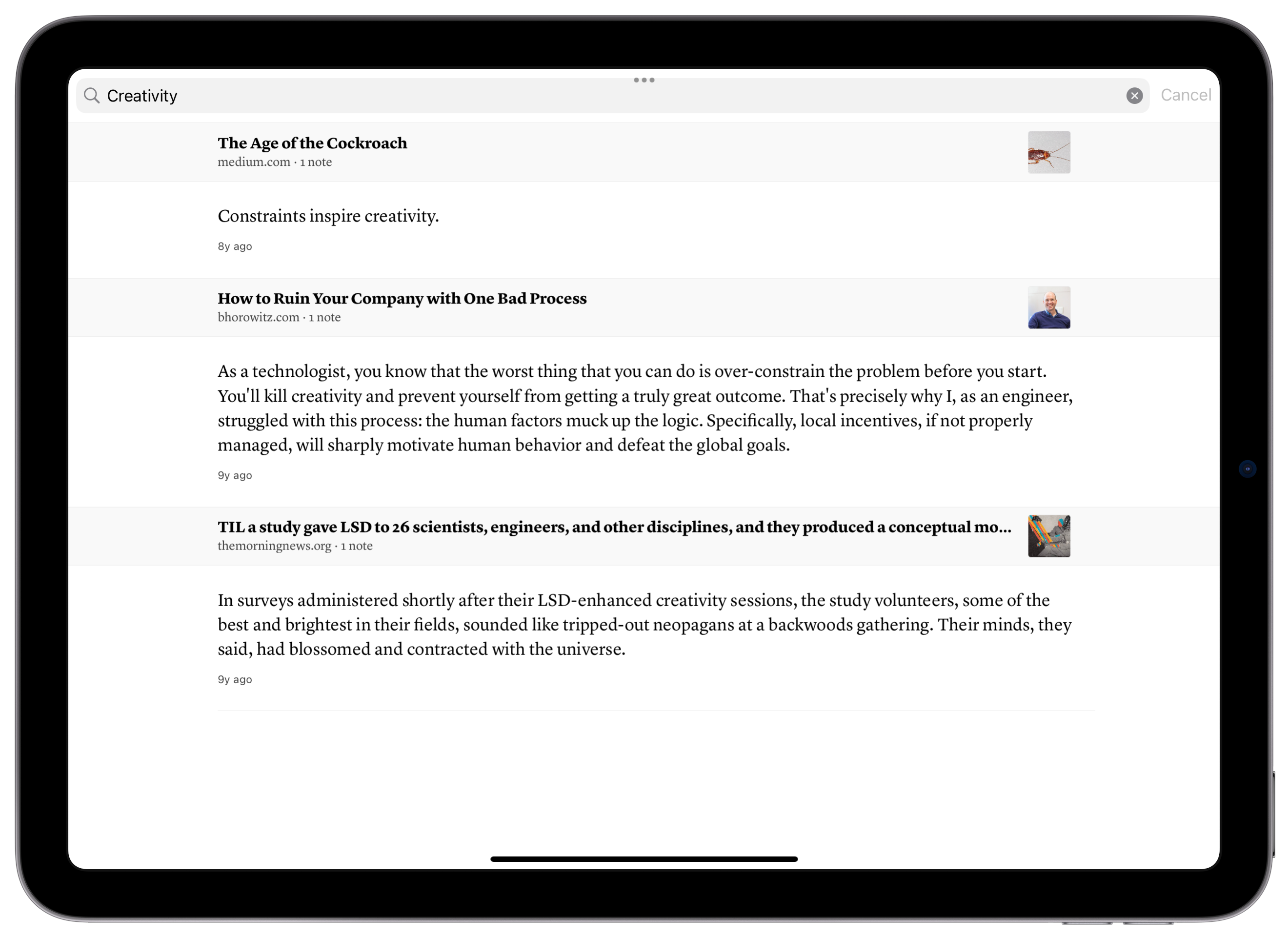 We finally added the ability to search the full-text of your highlights and notes on Instapaper. To search, navigate to the Notes section, tap the search bar, and enter your query.