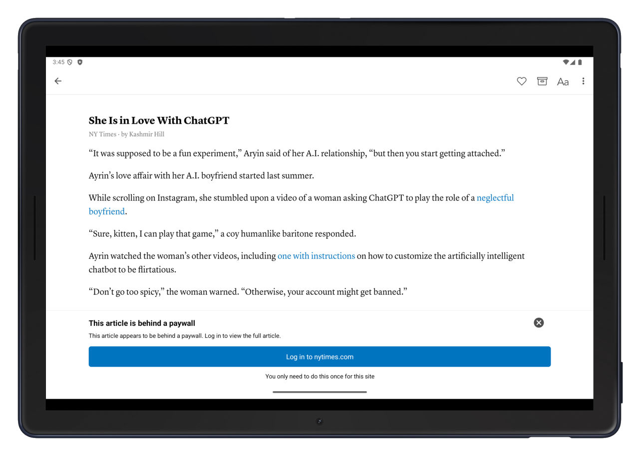On Instapaper Android, you can now sign in to websites directly within the app. When you’re logged into sites, Instapaper can more reliably retrieve and display complete articles, especially for websites with paywalls. You can learn more on the Logged-In Sites Launch Post.